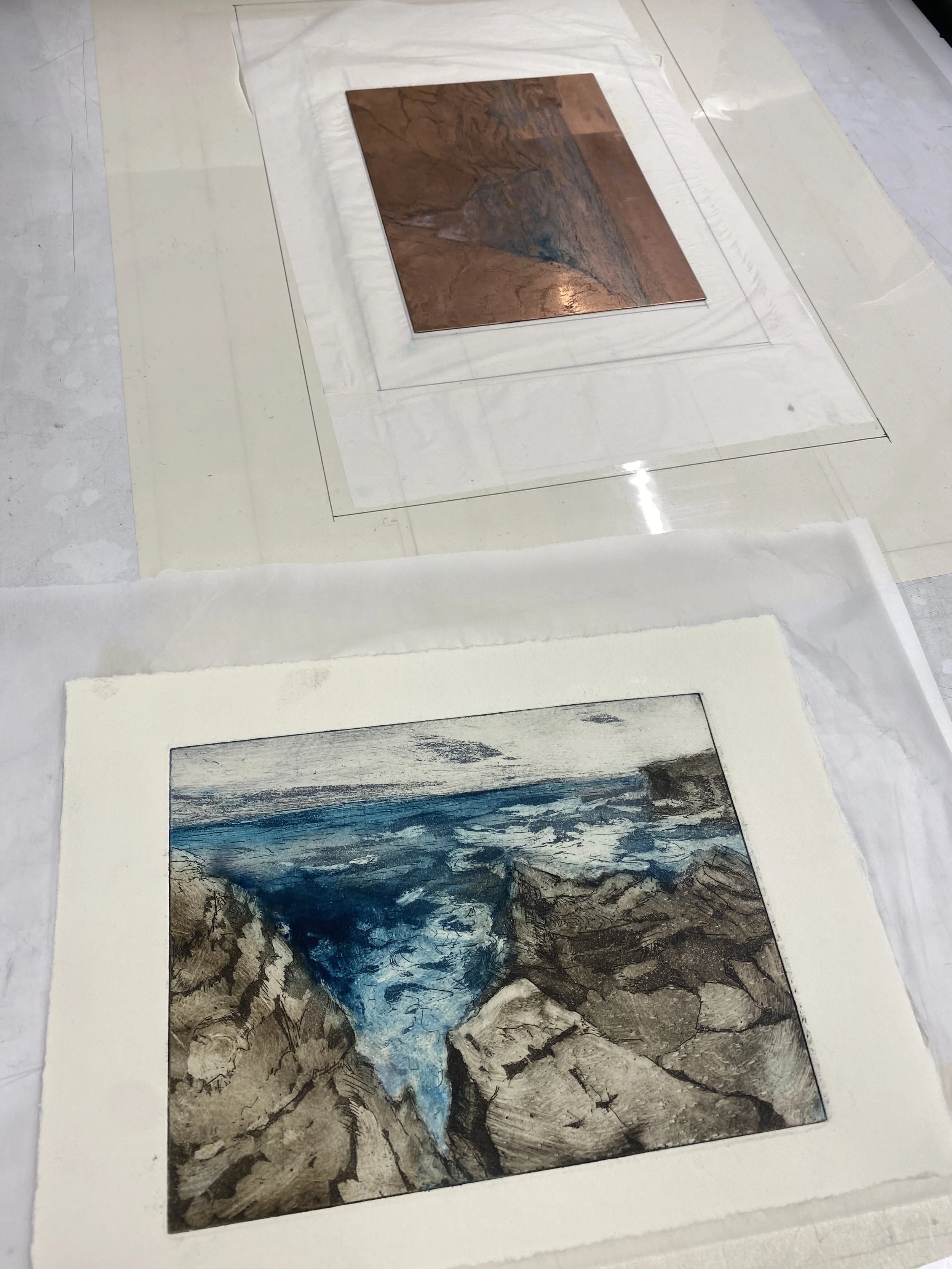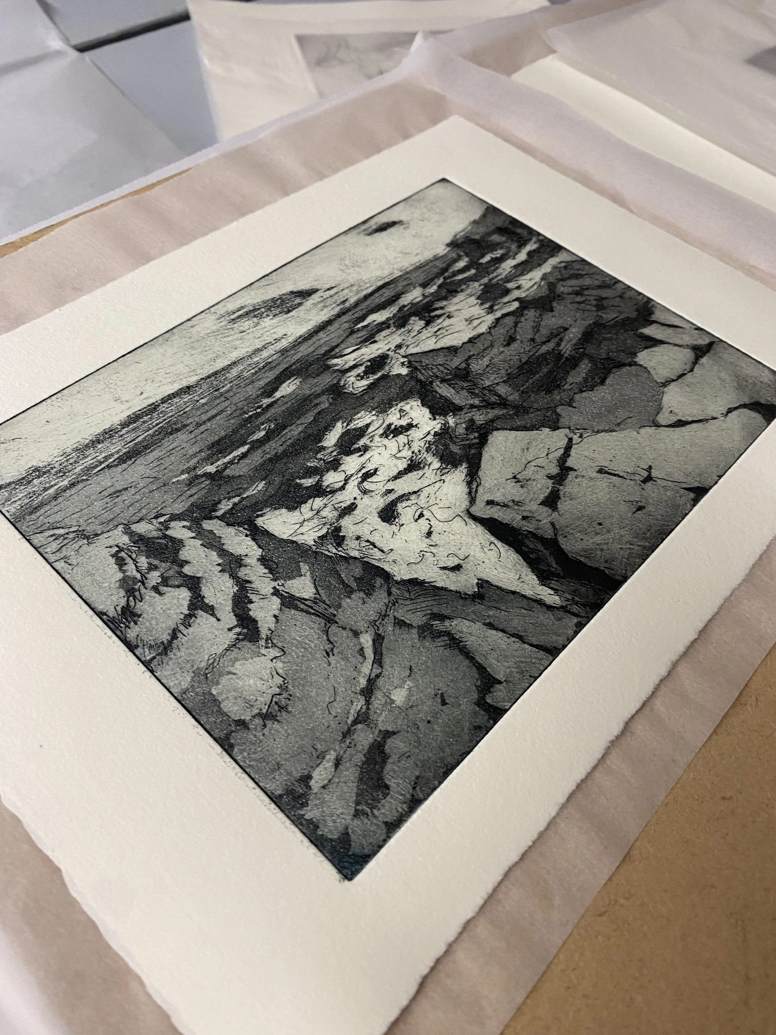 It’s been the longest winter, hasn’t it? I feel as though I am well accustomed to the grey Scottish weather, but even I have been at my wits end. Winter is the time where I master hunkering down, with maps and hot chocolate and hopes of adventures. However, by January I had done all that and was left with the creative reserves in need of a boost. Sometimes folk ask me if I ever find Scottish Seascapes restrictive and the honest answer is no. I suppose the thing that helps is that I am passionate about materials and process. I am curious and stay firmly in the seat of learner rather than master (other than the aforementioned hunkering down). The same scene can be captured in a variety of materials and each lends itself to giving a particular atmosphere. I have been keen to try printmaking for this reason, to see what it might lend to the creative approach. What can this technique offer that drawing and painting cant?